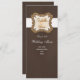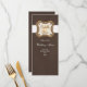 Brown, el amarillo, y la tarjeta anaranjada del menú de la boda del estampado leopardo con los acentos blancos y la foto del papel marrón con 3D texturizaron mirada como fondo impreso en el Libro Blanco llano. Una tarjeta temática del menú del boda del safari africano intrépido de la diversión. Diseño por los gráficos del © de Elke Clarke autorizados. Estampado de animales.