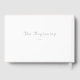 El diseño presenta un fondo blanco en todo el producto. La parte delantera muestra los nombres de la novia y el novio en una elegante tipografía Nupcial de color plateado. La foto que proporcionas se muestra como un óvalo en la esquina superior derecha. La esquina inferior izquierda presenta la imagen de una cruz plateada con iniciales unidas entrelazadas. La parte posterior presenta las palabras "El Comienzo" en la misma tipografía Nupcial. La columna vertebral muestra la frase "Nuestra Boda" también en tipografía Nupcial. Todo el texto es personalizable. Diseñado para coordinar con la colección "The Refined Catholic Wedding Suite".