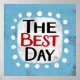 "El mejor día" es un lindo diseño de texto en azul claro con texto en negro y rojo, junto con una forma de acento blanco y puntos caprichosos de textura blanca que lo rodean.