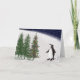 Un pingüino solo que comprueba hacia fuera un árbol de navidad.