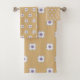 Un diseño de arte fractal de color morado y dorado está embaldosado a través de este juego de toallas de baño. El diseño tiene un aspecto floral. El fondo es dorado. También hay accesorios de baño a juego.