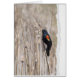 Pajarito rojo sobre tallo de cola con borde de papel roto.