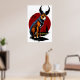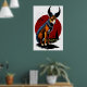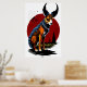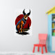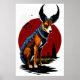 Un ilustracion personalizado de un perro con cuernos. El perro está sentado con el cielo rojo en el fondo. El perro lleva puesto un collar y una etiqueta. El perro te está mirando con una expresión juguetona. Este es un arte generado por IA.