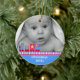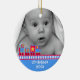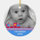 El primer ornamento navideño de un bebé dulce hecho de cerámica redonda con un cordón dorado de bonito. Gráficos de un colorido tren de juguete que bordea un fondo azul, en el fondo del adorno, y una fotografía personalizado, en la parte superior del adorno. El texto blanco en el área azul inferior y en el reverso es completamente personalizable. Personaliza todo el texto y la foto de tu bebé, para una dulce primera Navidad o como un regalo encantador para los nuevos padres o abuelos.