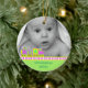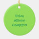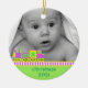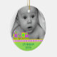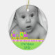El primer ornamento navideño de un bebé dulce hecho de cerámica redonda con un cordón dorado de bonito. Gráficos de un colorido tren de juguete con colores como neón que bordea un fondo verde claro, en el fondo del adorno, y una fotografía personalizado, en la parte superior del adorno. El texto verde en la parte inferior y en la parte posterior es totalmente personalizable. Personaliza todo el texto y la foto de tu bebé, para una dulce primera Navidad o como un regalo encantador para los nuevos padres o abuelos.