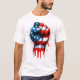 Este diseño de camisetas presenta un puño potente levantado alto, simbolizando fuerza y unidad. El primero está adornado con colores rojo, blanco y azul audaces, que representan patriotismo y orgullo. Para añadir un efecto dramático, el rojo, el blanco y el azul parecen estar goteando desde el puño con un fondo rojo, creando una visión llamativa y dinámica. Este diseño captura un sentido de determinación y resiliencia, lo que lo convierte en una pieza destacada.