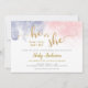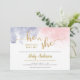Este género horizontal revela la invitación a la fiesta presenta un texto de caligrafía purpurina falso dorado sobre un fondo de color rosa y azul oscuro. Personaliza esta invitación divertida y moderna con tu información de fiesta.