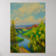 Un río azul que atraviesa el bosque con árboles verdes a ambos lados del río, se puede ver una pequeña colina abierta más abajo al lado del río, cielo azul con mucha nube en él. Esta es una pintura impresionista generada por IA.