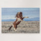 El joven semental de la banda, Splaash, toma una pose cuando se enfrenta a un grupo de sementales de soltero que se acercan demasiado a sus yeguas.