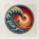 Captura la emoción del océano con esta vibrante obra de arte circular que presenta una audaz ola bajo un intenso atardecer. El diseño muestra una osada silueta surfista contra la dramática interacción de naranjas cálidos y rojos en el cielo, mezclándose perfectamente con el fresco azul del agua. Perfecto para los que aprecian la aventura, la libertad y la belleza cruda de la naturaleza, esta pieza irradia energía y movimiento. Ideal para vestimenta, decoración o accesorios.