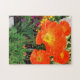 Estos brillantes naranjas, California Poppies, contrastan maravillosamente con los verdes y las flores de acento morado en el fondo. Los detalles sutiles hacen que un rompecabezas desafiante se rompa.