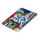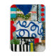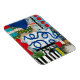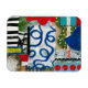 El Path Ahead es una obra de arte de medios mixtos de collage llena de formas geométricas, círculos, torbellinos, rayas y más. De color completo, el conjunto es rojo, azul, verde, amarillo y tostado de borde a extremo.
