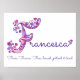 Hermoso cartel con monograma de la letra F perfecto para el dormitorio o sala de juegos de una niña en tonos rosa y púrpura. Personaliza con tu nombre que comience con F y el significado del nombre para un toque verdaderamente personalizado en el dormitorio o nursery de tu hijo, este ejemplo es para el nombre Francesca de Francia. Gratis, honesta, paciente y amable. Lindo póster ideal para un nuevo bebé, regalo de bautizo o baby shower o para el dormitorio de un niño. © Diseño de arte gráfico y dibujo de corazones y flores con monograma de letra F único por Sarah Trett. www.sarahtrett.com para www.mylittleeden.com