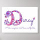 Hermoso arte de monograma D nombre del cartel perfecto para el dormitorio de una niña o sala de juegos en tonos de azul marino, blanco, rosa y púrpura. Personalice con el nombre corto de su hijo que comienza con D, y el significado del nombre para un toque verdaderamente personalizado en el dormitorio o guardería de su hijo, este ejemplo es para el nombre Darcy Un conquistador chic, rico, valiente y sin miedo. Impresión de cartel lindo ideal para un regalo de bebé nuevo, bautizo o baby shower. © Diseño de arte gráfico y dibujo de corazones y flores con letra D monograma única por Sarah Trett. www.sarahtrett.com para www.mylittleeden.com