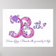 Hermoso cartel con monograma de la letra B perfecto para el dormitorio o sala de juegos de una niña en tonos de gris, blanco, amarillo, rosa y morado. Personaliza con el nombre corto de tu hijo que comience con B, y el significado del nombre para un toque verdaderamente personalizado en el dormitorio o nursery de tu hijo, este ejemplo es para el nombre B Beth House of figs. Bendecido con generosidad y estilo. Impresión de cartel linda ideal como regalo para un bebé recién nacido, bautizo o baby shower. © Diseño único de monograma de la letra B con corazones y flores y arte gráfico por Sarah Trett. www.sarahtrett.com para www.mylittleeden.com