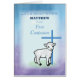La oveja está frente a una cruz azul en esta tarjeta de felicitaciones católicas mientras celebras la Primera Confesión de un niño.