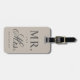 Una etiqueta moderna y divertida para el equipaje que incluye el texto de Mr. y Mrs. y el nombre de la familia a continuación en una mezcla de tipos de letra específicos de género. Perfecto para recién casados y luna de miel.
