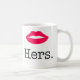 Una taza de café divertida que ofrece la palabra "el suyo" en un sistema de labios rosados brillantes sobre él.
