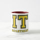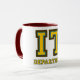 ÉL taza del departamento. Si usted está en el departamento de la tecnología de la información, usted puede mostrárlelo apagado con esto taza de café del departamento. Por supuesto, usted puede poner té en él. O cacao caliente. O soda. El diseño es una fuente que parece universidad y deportes. Una fuente gruesa del trazo de pie, ya no sabe. Las letras son amarillo de oro con una frontera verde azulada fina y una frontera marrón más gruesa. Una taza de café del friki de la diversión.