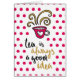 La tarjeta ilustrada linda que ofrece una taza caliente de té con negro y el oro script la escritura en un fondo rosado del modelo de lunar.