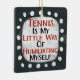 Un diseño tipográfico irreverente que dice "El tenis es mi pequeña forma de humillarme". Presenta texto en negro y rojo sobre un rectángulo blanco con puntos blancos divertidos y juguetones rodeándolo, todo sobre un fondo gris oscuro.