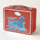 Fiambrera metalizado de vapor de la diversión del tren azul de la locomotora perfecta para un entusiasta joven del tren, un constructor modelo del tren o un trainspotter. Personalizar con su propio nombre en el tren. Lee actualmente a Pedro. Ilustracion y diseño de Sarah Trett para www.mylittleeden.com en zazzle.