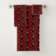 Este impresionante juego de toallas de baño con estampado presenta una imagen de arte digital de un estúpido pero lindo Vampiro de Halloween. El vampiro tiene el pelo negro puntiagudo, una camisa roja y una chaqueta negra con los botones en forma de corazón rojo sanguíneo. Tiene una sonrisa espeluznante y largos colmillos blancos. También tiene uñas amarillas, calcetines morados y zapatos negros con hebillas de oro sobre ellas. Sus brazos están abiertos dándote la bienvenida a un abrazo malvado.