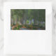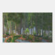 Una mesa de árboles en un soleado día de verano. Los árboles altos son altos y oscuros, pero los saplings de abajo tienen un nuevo y brillante crecimiento. Crecer a través de las hojas caídas es el verde, el rosa y el blanco del trébol y otras cubiertas de tierra.
