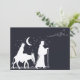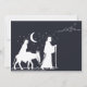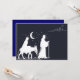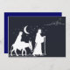 Una invitación a los Navidades con temática azul y blanca, en la que María y José viajan a Belén, visible a lo lejos.