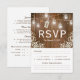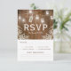 TARJETAS DE OPCIÓN DE MENÚ RSVP DE BODA COUNTRY CHIC | Fondo de madera de granero rústico, luces de frasco de mason con luces parpadeantes de cuerda, una decoración de esquina floral de flor de bebé, una etiqueta atada con un nudo con tus iniciales y una plantilla de menú de boda y opción de respuesta.