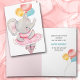 ¡Aquí hay una linda tarjeta de cumpleaños para cualquier niño! En la parte delantera hay un elefante gris vestido con una túnica rosada y zapatillas de ballet. Ella sostiene una cuerda con tres globos de colores brillantes. El interior de la tarjeta tiene campos de texto en gris y verde azulado para que usted personalizar o se vaya como está. También tiene una segunda imagen de los globos.