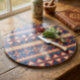Lleva color y cultura a tu cocina con esta tabla para cortar de vidrio *Aztec Elegance*. Diseñada con llamativos patrones tribales rojos, azules y beige, esta pieza de vidrio templado sirve como espacio de preparación funcional y decoración llamativa. ¡Añade un toque de encanto del suroeste a tu encimera!