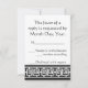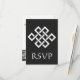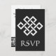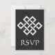 Esta elegante tarjeta RSVP presenta un fondo negro y un gran nudo chino de buena suerte en blanco en la parte delantera. Un borde negro a lo largo del borde inferior de la tarjeta con un patrón geométrico blanco inspirado en la ornamentación china decora la parte posterior con un texto de muestra en el lugar superior que puede ser personalizado para adaptarse a sus necesidades. No olvide visitar los otros productos de la colección Chinese Elegance in Black para crear una imagen verdaderamente coordinada para su evento.
