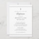 La clásica y elegante invitación al bautismo es una invitación moderna y limpia con rayas grises pastel y una cruz mínima con un texto gris editable.