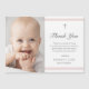 Chicas de Elegancia Moderna Baptism Gracias tarjeta es moderna y limpia, con franjas rosas suaves y una cruz con foto. La espalda es un imán. El tipo de personalizable gris le permite cambiar toda la información de la tarjeta a su gusto. Perfecto para el bautismo de un niño pequeño.