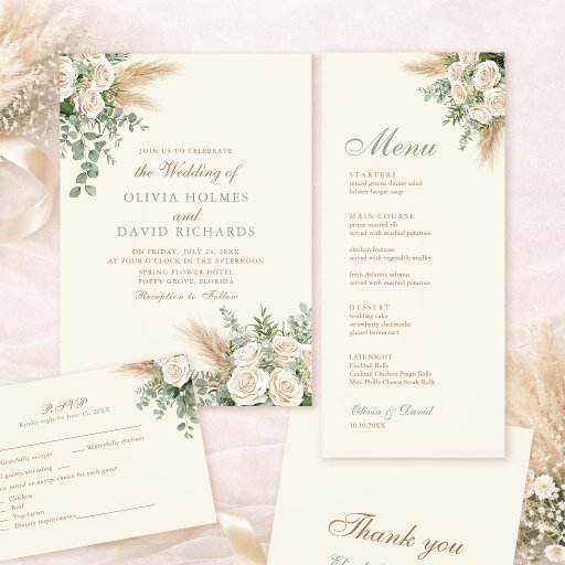 Elegant Beige Pampas Grass & Rose Wedding RSVP