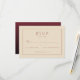 This elegant wedding RSVP card features a minimalist design with a soft beige background and a subtle maroon border, creating a sophisticated look. The layout is clean and balanced, with a prominent serif font for the "RSVP" text, enhancing its formal appeal. Customizable lines allow guests to indicate their attendance status and number of attendees, ensuring clarity and ease of use. Perfect for couples seeking a classic and refined touch for their wedding stationery, this card conveys an air of elegance and formality.