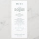 This elegant wedding menu features a clean, vertical layout with ample negative space, creating an airy and sophisticated feel. The design utilizes a minimalistic black text on a white background, emphasizing clarity and simplicity. Serif fonts in varying sizes provide a timeless touch, while the structured sections for starters, salad, main course, and dessert ensure easy navigation. Perfect for formal events, this menu combines classic style with functional organization, making it ideal for couples seeking a refined presentation for their special day.