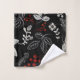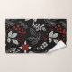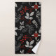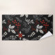 Elegant botanical pattern on black background featuring white leaves, red berries, and intricate floral designs in gold accents, creating a festive, decorative feel.