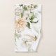 Elegant floral towels with soft, pastel flowers and green leaves displayed on a light wall. One is hung, the other folded, creating a tranquil vibe.