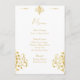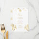 A gold and white damask wedding menu featuring a classic, elegant design with intricate gold damask patterns on a white background, accented with gold for a luxurious, formal feel. These invitations are ideal for upscale or traditional weddings, setting a tone of grandeur and sophistication. This wedding menu is part of a set.