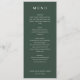 This elegant wedding menu features a deep forest green background with crisp, white text arranged in a clean and minimalist layout. The design utilizes a combination of serif and sans-serif fonts to create a sophisticated look, emphasizing clarity and readability. Each section is neatly divided by horizontal lines, enhancing the organized presentation of the meal options. Perfect for formal occasions, this template exudes refinement and simplicity, making it an ideal choice for couples seeking a classic yet modern aesthetic for their special day.