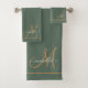 Personalized elegant monogram green gold script name bathroom towel set gold borders. Refresh your bathroom decor with a minimalist typographic style.