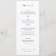 This elegant wedding menu features a clean, minimalist layout with ample negative space for a sophisticated look. The design utilizes a navy blue and gray color palette, creating a formal yet inviting atmosphere. Serif fonts are used throughout, adding to the classic and refined aesthetic. Perfect for weddings or formal events, this template offers customizable sections for starters, salad, main course, and dessert, ensuring it can be tailored to any celebration.