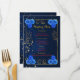 Enhance your reception tables with this elegant blue floral wedding menu card featuring a luxurious gold border. Designed with delicate navy blue watercolor flowers and a classic gold frame, this menu card perfectly complements blue and gold wedding themes.