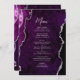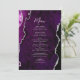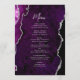 This elegant modern wedding menu features a purple watercolor agate background trimmed with faux silver glitter. The customizable text combines silver gray handwriting script and copperplate fonts. The reverse side features a matching purple and silver agate design.
