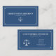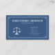Una elegante tarjeta de visita con un ilustracion de escalas de justicia en tonos azules y blancos. Ideal para abogados y todo tipo de prácticas legales y actividades de justicia.