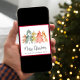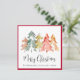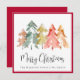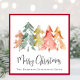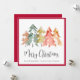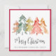 Elegante tarjeta cuadrada roja de vacaciones para su negocio con un moderno resumen acuarela de pinos, "Feliz Navidad" en un guión elegante y el nombre de su empresa en la típica tipografía serif.