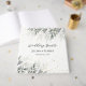 Un elegante acuarela deja un libro de Bodas diseñado con hojas de color verde suave sobre un fondo blanco con acento dorado. El texto incluye: Los primeros nombres de la novia y Groom y La fecha del Boda. Para personalizar, simplemente inserte su texto en nuestra plantilla sencilla, reemplazando el ejemplo. No olvide ver la colección de Bodas Elegant Watercolor Leaves para tarjetas y accesorios a juego.