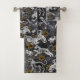 la moderna toma de mosaicos bizantinos antiguos con animales y viñetas sobre fondo oscuro que se parecen a la noche estrellada y las constelaciones en el cielo en blanco y negro monocromático con adornos de oro amarillo